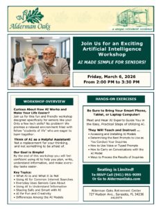 Are you curious about how artificial intelligence (AI) can make your life easier? Join us at the Alderman Oaks Retirement Center in Downtown Sarasota for a fun and friendly workshop designed specifically for seniors like you! No tech skills? No problem! We promise a relaxed environment filled with fellow “students of life” who are eager to learn together.