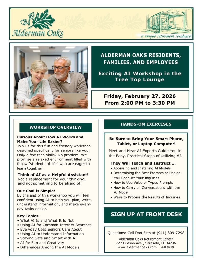 Are you curious about how artificial intelligence (AI) can make your life easier? Join us at the Alderman Oaks Retirement Center in Downtown Sarasota for a fun and friendly workshop designed specifically for seniors like you! Limited tech skills? No problem! We promise a relaxed environment filled with fellow “students of life” who are eager to learn together.